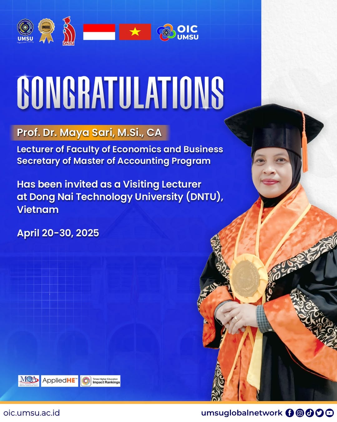 Professor Dr. Maya Sari, M.Si., CA., a lecturer at Universitas Muhammadiyah Sumatera Utara (UMSU) who was recently appointed as a professor in accounting in 2025, has been invited to serve as a Visiting Lecturer at Dong Nai Technology University (DNTU) in Vietnam. She is recognized as one of UMSUโs distinguished faculty members and currently holds the position of Secretary for the Master’s Program in Accounting at the Faculty of Economics and Business. Her academic engagement at DNTU is scheduled for Sunday to Wednesday, April 20โ30, 2025.