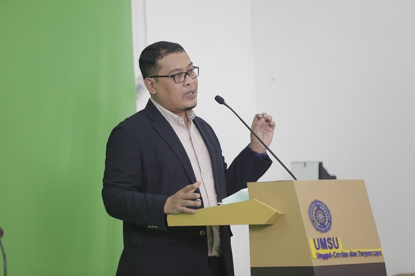 “Mau tak mau kita harus masuk ke era new normal dan hidup dengan Covid-19. Tenyata era revolusi 4.0 juga semakin menjadi-jadi. Tenaga-tenaga manusia berganti dengan mesin dan IT,” ujar dekan FISIP UMSU sebagai pemantik.