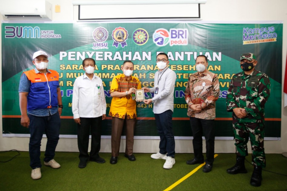 Medan, PT. Bank Rakyat Indonesia (BRI) cabang Medan Thamrin menyerahkan bantuan alat kesehatan senilai Rp. 250 Juta kepada RSU Muhammadiyah Sumatera Utara (RS UMSU) dalam rangka peduli penanggulangan pandemi Covid-19, Rabu (13/10) siang di aula Rumah Sakit Umum Muhammadiyah Sumatera Utara, Jl. Mandala, Medan Denai.